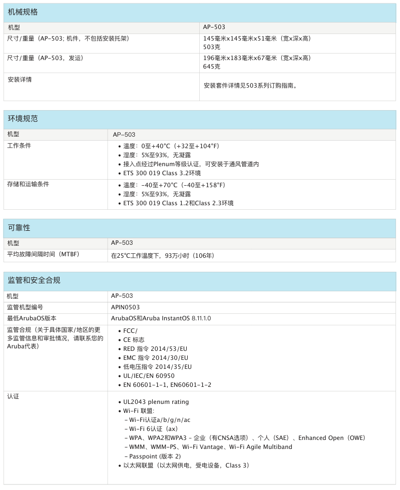室内中密度Wi-Fi 6接入点AP-503提供兼具高成本效益与高性能的连接,可以帮助各类组织应对因移动使用需求提高、转向云或物联网环境而带来的设备增长挑战。503 系列的实际聚合数据速率高达 1.775 Gbps(HE80/HE40),可以为学校、中型办公室和零售卖场等中等密度的场地和工作场所提供所需的连接速度和可靠性。