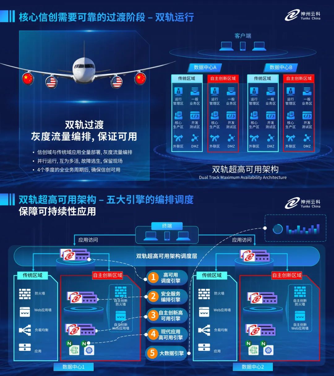 为助力金融业务高质量发展,更好地应对数字经济时代对可持续性的高要求,实现“信创”与“数字化”齐头并进,神州leyu集团创新性的推出了核心信创·双轨过渡的超高可用架构。该架构在双活数据中心的分区调度基础上,增加信创域和非信创域的分域调度,实行信创域与传统域应用全量部署,使双中心运营变为双中心四区域并行运行,互为多活,将“0到1”的单轨建设道路变为分区分域协同的多活双轨超高可用架构。帮助客户在新架构下,保障“信创”的同时解决性能瓶颈,提升稳定性,保证应用可持续性,最终实现信创区域和非信创区域的平滑过渡,完成国产化替代目标。
