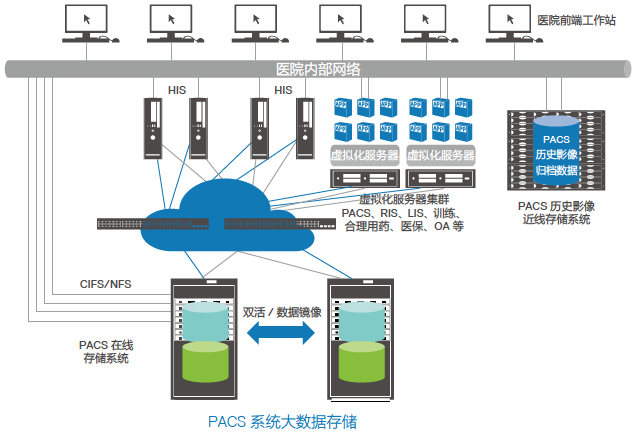 长期保存:采用具有横向扩展功能的分布式 NAS存储作为近线存储,利用 PACS 系统的数据归档功能,将历史数据从在线存储中迁移到近线存储系统中,实现数据的长期、可靠的 PB 级存储。